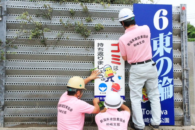 ごみの持ち帰り看板を取り付ける県建設業協会柏崎支部青年部会 (2016/06/29)