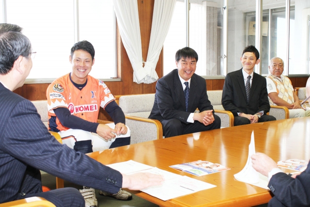 市長を表敬訪問したアルビBCの前川投手(左から2人目)ら=17日、市役所市長応接室