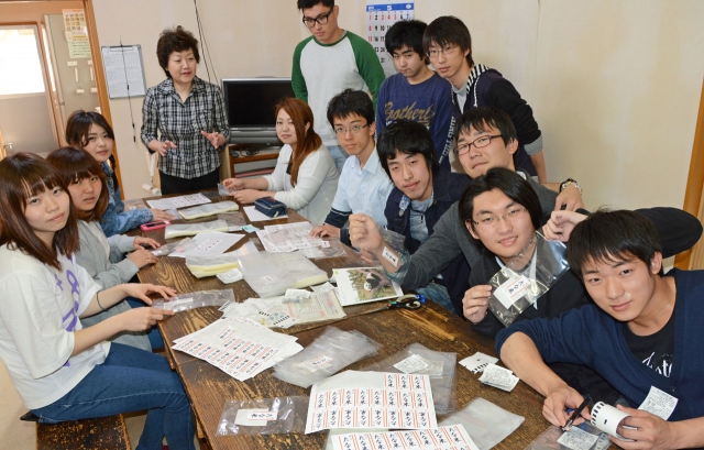 東京の新宿高島屋の「大学は美味しい!」フェアの出展に向け、シール貼りの作業をする学生ら=市内駅前1、新野屋