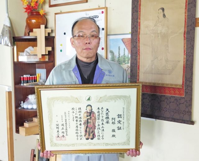 本県で初めて「大匠棟梁」認定を受けた阿部社長=市内三和町の工場 (2016/05/07)
