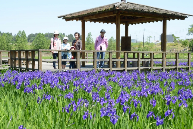 水辺を彩るカキツバタの紫色の花。見頃の時期を迎えた=8日午前、市内軽井川の柏崎・夢の森公園 (2016/05/09)