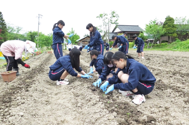 ケナフの苗を植える産大附属2年生=6日、市内加納 (2016/05/11)
