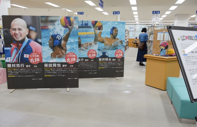 「図書“間”ミニ展示〜柏崎 水球の歴史〜」。展示物を通し、柏崎の水球の歴史に焦点を当てた=ソフィアセンター (2016/05/12)