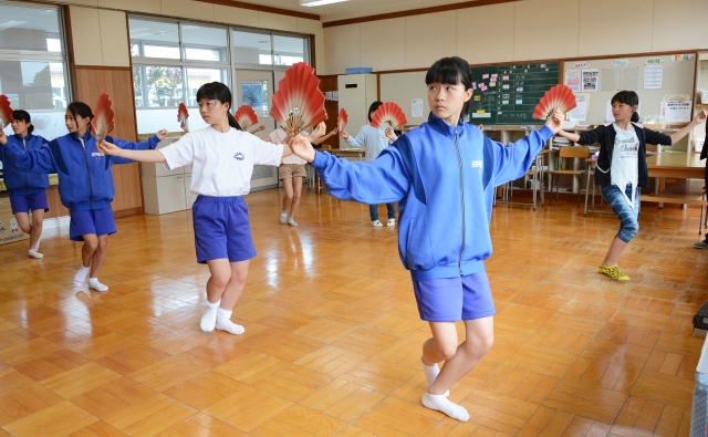 綾子舞の今年の練習を開始した南中、新道小の児童生徒=南中 (2016/05/14)