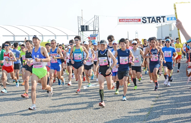 潮風マラソン・フルの部で一斉にスタートするランナー=15日午前8時、みなとまち海浜公園 (2016/05/16)