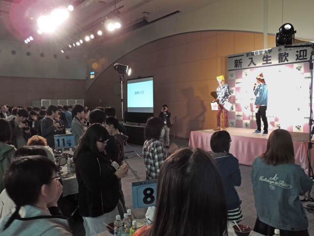 柏崎に関するクイズやパズルなどを楽しんだ新潟産大・新潟工科大新入生歓迎会=13日、市民プラザ (2016/04/15)