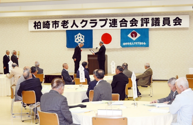 市老連評議員会で行われた永年勤続会長の表彰式=産文会館大ホール (2016/04/16)