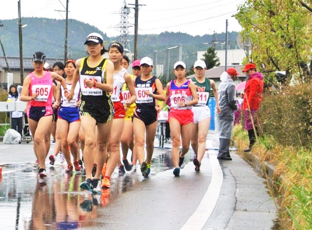 女子高校3キロで4位入賞した産附2年・山田美慶選手(先頭)=17日、輪島市文化会館周回コース (2016/04/19)