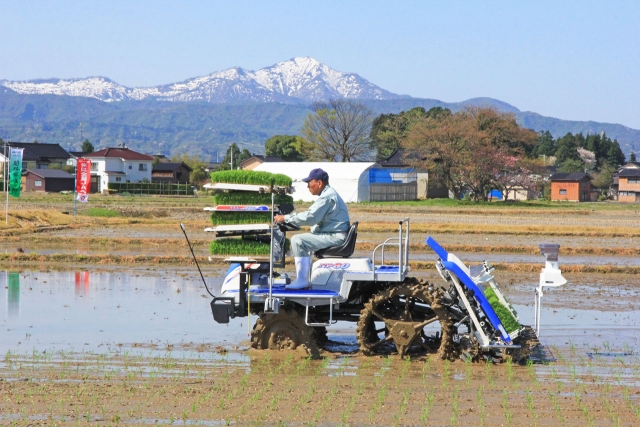 青空の下で、今年もスタートした早期栽培越路早生の田植え=20日、市内上藤井 (2016/04/20)