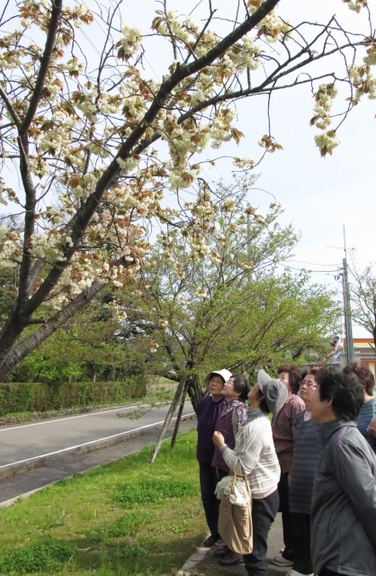 珍しい桜「御衣黄」を楽しむ地域の人たち=20日、北鯖石コミセン (2016/04/21)