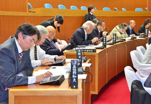 市議会で行われたタブレットの講習会=21日、議場 (2016/04/22)