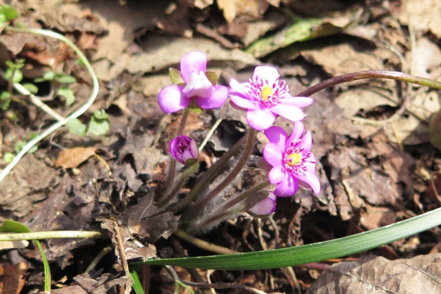 かれんな花を咲かせ始めた遊歩道の雪割草=西山・大崎雪割草の里園内 (2016/03/11)