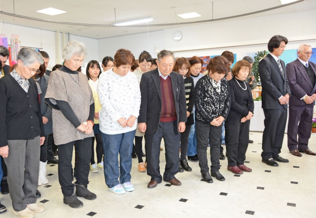合同追悼式で黙とうをする福島県からの避難者=11日、市内東本町1の被災者サポートセンター「あまやどり」 (2016/03/12)