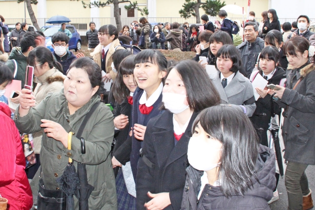 合格者の番号が張り出され、喜びに沸く受験生=14日午後2時ごろ、常盤高 (2016/03/14)