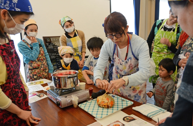 交流会でビニール袋を使った災害食作りを習う参加者=市内西本町3、まちから (2016/03/15)