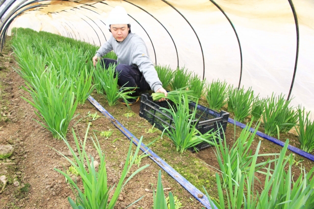 スタミナ野菜の一つ、ニラの収穫が始まった小畑農場=市内南条 (2016/03/16)