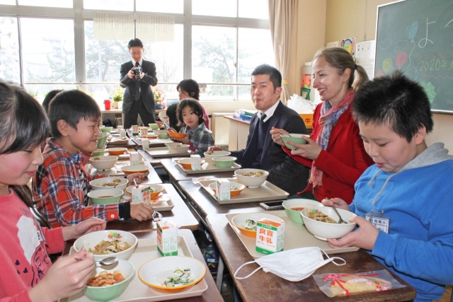 柏崎小児童と一緒に水球応援給食を楽しむコンティッチ参事官(右手前から2人目)=18日、同校 (2016/03/19)