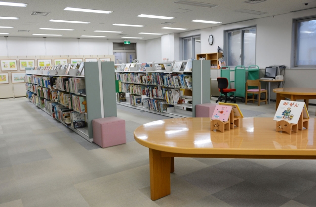 新たに設けられた「えほんのへや」。絵本、紙芝居が並び、表紙でも楽しめるしつらえだ=ソフィアセンター (2016/02/29)