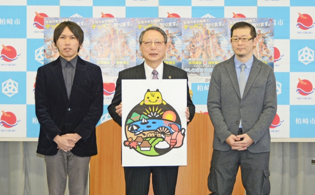 正式決定したシンボルマークを披露する会田市長。右は徳間さん、左は谷川さん=2日、市役所大会議室 (2016/03/02)