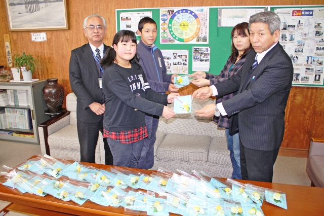 卒業児童らに約50個のコサージュを贈った上条コミセンの戸田会長(手前右)ら=1日、新道小 (2016/03/03)