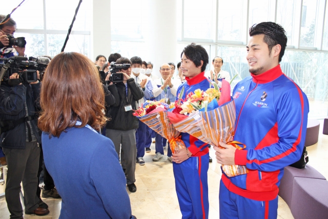 ブルボン本社で花束を受け取る志水選手(手前)と筈井選手(奥)=7日、市内駅前1 (2016/03/07)