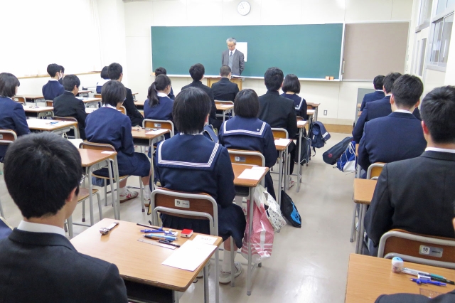 受験票や筆記道具を机に置き、問題用紙の配布を待つ受験生=8日午前9時前、柏高 (2016/03/08)