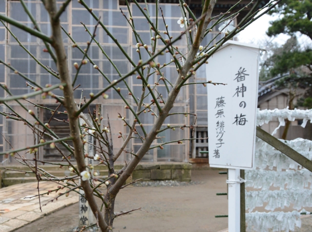 白くかれんな花を咲かせ始めた番神堂の梅の木 (2016/03/10)