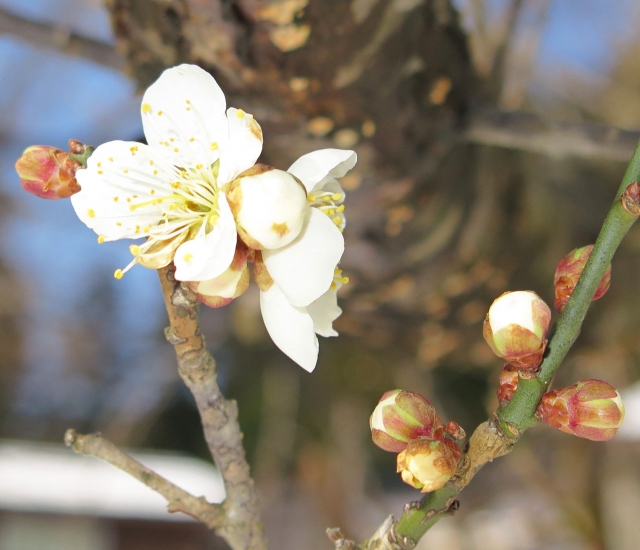 春の便りをのせ、咲き始めた梅の花=19日、市内谷根 (2016/02/19)