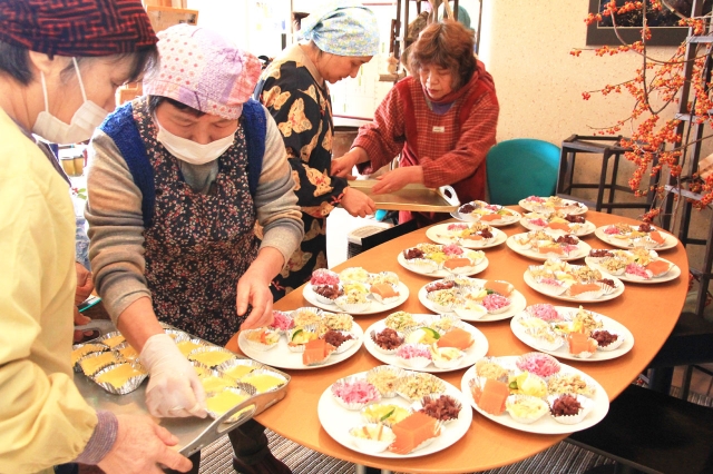 レシピ集「さなぶり」を基に、北条の郷土料理を次々と完成させた講習会参加者 (2016/02/20)