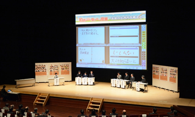 「未来の生き方を考える」をテーマに、授業形式で進めた「教育を語る会」=20日、アルフォーレ・大ホール (2016/02/22)