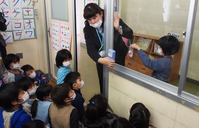 「防災教育プログラム(原子力災害編)」を使った特別授業を受ける1年生=23日、日吉小 (2016/02/23)