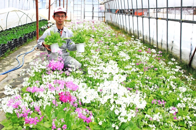 一足早く、春を感じさせてくれているサクラソウの花=市内堀、中村農場 (2016/02/26)