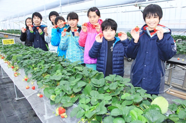 昨秋苗を植えたイチゴ「越後姫」の摘み取り体験をする鯨波小5年生=市内鯨波、ファームくじらなみのハウス  (2016/02/27)