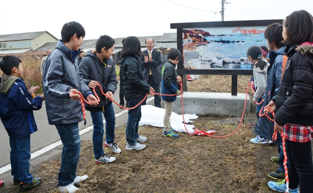「三ツ石」のメモリアル看板の除幕を行う大洲小児童=市内番神1 (2015/11/26)