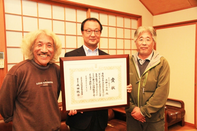 博報賞を手にした高柳小の石川校長(中央)。左が越後門出和紙の小林代表、右はゆめおいびとの中村代表 (2015/11/27)