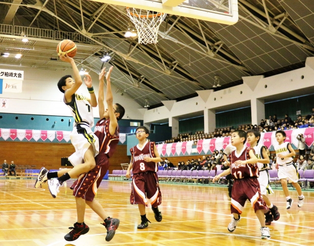 若菜杯ミニバス男子決勝の槙原(白色ユニホーム)―柏崎戦=市総合体育館 (2015/11/28)