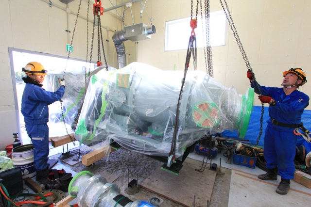 赤坂山浄水場内に設置された建屋に搬入される水車発電機設備 (2015/12/01)