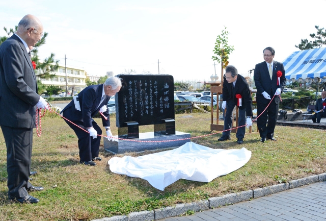 萩原朔太郎の孫・朔美さん(右から2人目)を迎え、詩碑「海水旅館」の除幕式 =1日、アクアパーク裏 (2015/11/02)