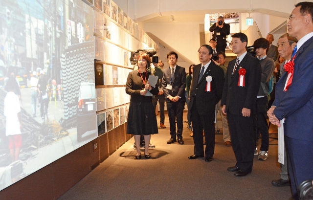 市民活動の拠点としてオープンした「まちから」。中越沖地震シアターで当時の災害の状況、各地の防災活動の映像を見る参列者=5日午前、市内西本町3 (2015/11/05)