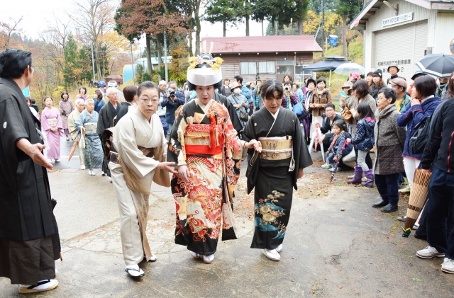昔ながらの“祝言”を再現した花嫁行列=8日、高柳町石黒 (2015/11/09)