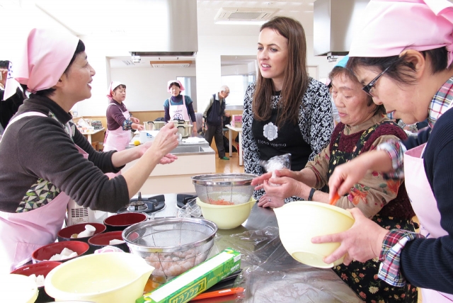 郷土料理の作り方を教わるフィオナさん=11日、ゆうぎ (2015/11/12)