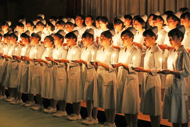 ともし火を手に、看護の道へまい進を誓った戴帽式=新潟病院附属看護学校 (2015/10/23)