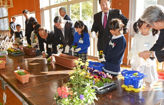 贈呈式で、児童と一緒に花苗を植えるブルボンの吉田社長(右から6人目)=27日午前、柏崎小 (2015/10/27)