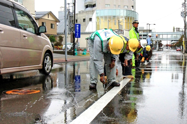 消雪パイプのノズルから均一に水が出るよう調整する委託業者=市内西本町1の国道352号 (2015/10/28)