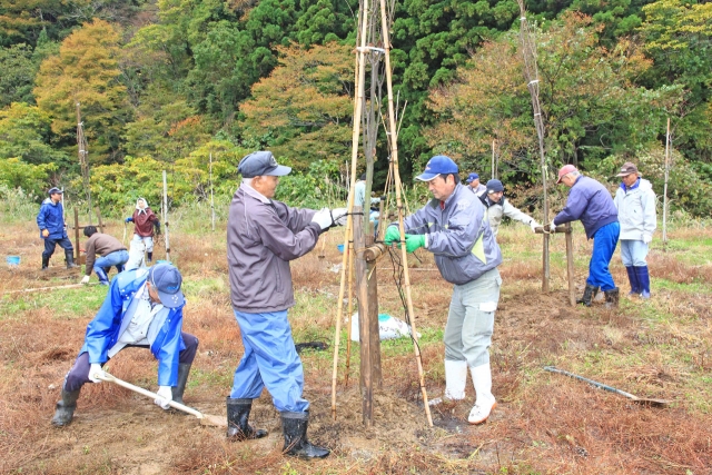 豊かな森と川、海を願い、桜とケヤキを植える参加者=31日午前、市内谷根の六拡トンネル出入り口広場 (2015/10/31)