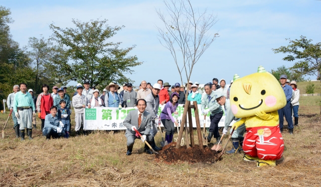 100人が参加した柏崎刈羽地域植樹祭。苗木を植える会田市長ら=10日、市内安田の田尻いこいの広場 (2015/10/10)