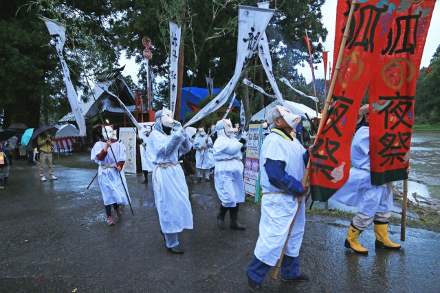 雨の中で、栃ケ原神社を出発する狐の夜祭りの行列=高柳町 (2015/10/13)