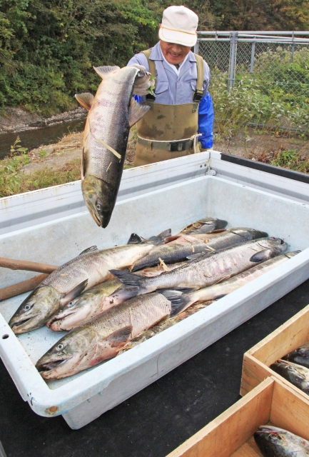 谷根川にそ上し、捕獲されたサケ (2015/10/17)