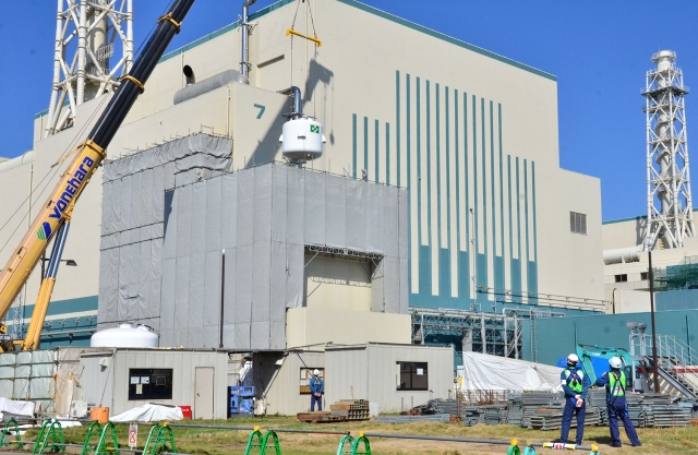 クレーンを使って、柏崎刈羽原発7号機のフィルター付きベント設備につり込むヨウ素フィルター=21日午前 (2015/10/21)