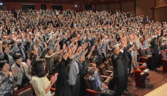 第2次成人式で元気に万歳三唱をする出席者=30日午前、アルフォーレ・大ホール (2015/09/30)